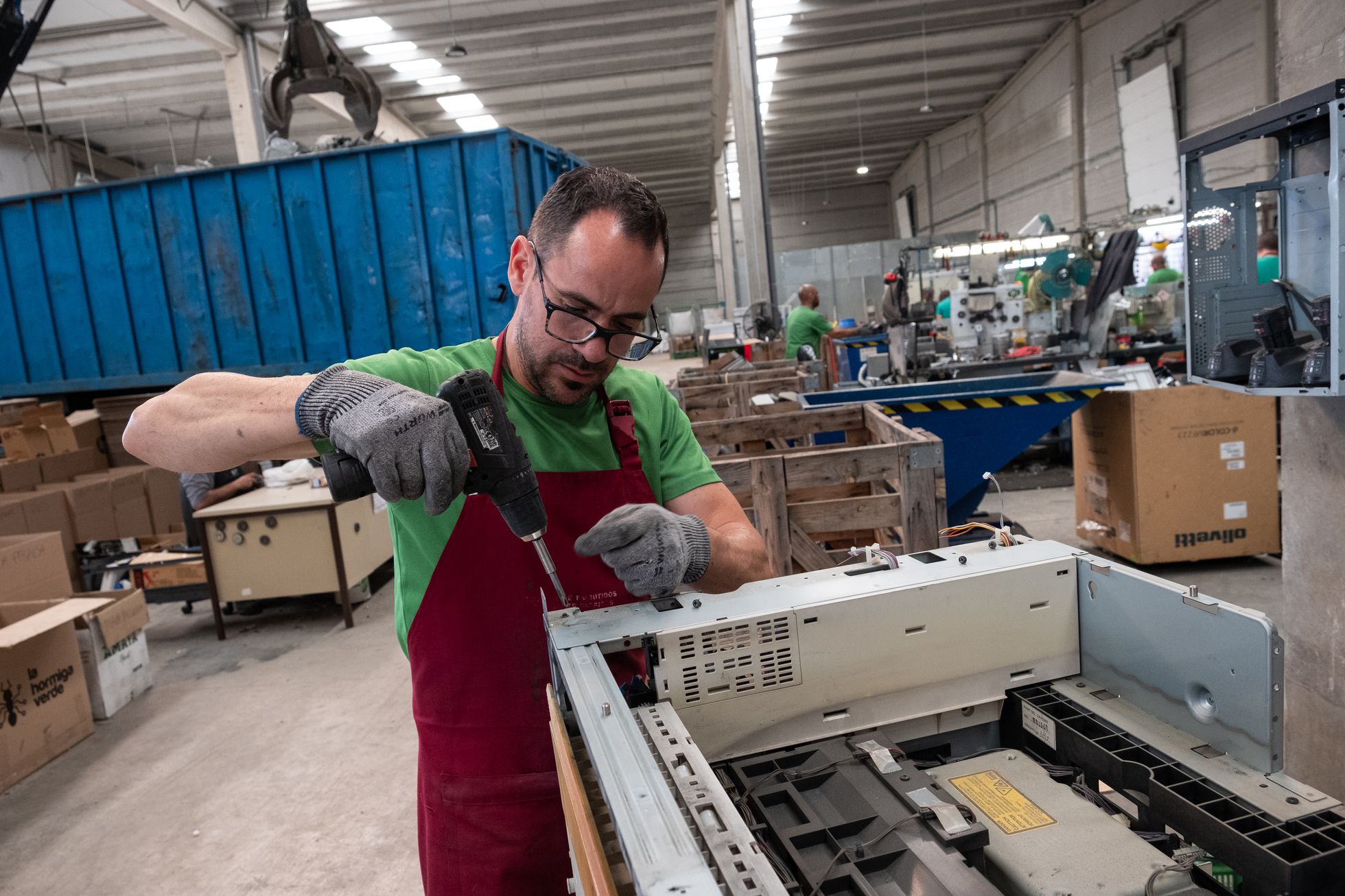 En La hormiga verde, una empresa ubicada en Villafranca de los Barros (Badajoz), no existe el concepto de usar y tirar. Esta compañía nacida en 2018 se dedica exclusivamente a la gestión de basura electrónica, dándole una segunda vida a los residuos tecnológicos. Si el modelo imperante es consumir y desechar, aquí defienden el reducir y reutilizar, como explica el ingeniero industrial y gerente, Ignacio García, de 50 años: “Recuperamos el 100% de las materias primas de los aparatos”. García proviene del sector de la biomasa y abrió la empresa al quedarse en paro: “Empecé solo, desmontando aparatos, quería aprender antes de llamar a nadie”. En 2019 pidió un préstamo al banco, contrató a 10 empleados y facturó 100.000 euros. Ahora el escuadrón de hormigas factura 900.000 euros y está compuesto por 31 personas, de las cuales 29 son discapacitadas. Tienen clientes en Madrid, Valencia, Sevilla y en Holanda. García sostiene que el éxito de una empresa no es del dueño sino de su equipo: “Mi modelo ideal de negocio aúna el ecologismo con la empatía social”.