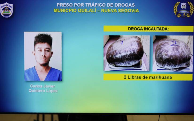 También por tráfico de droga fueron capturados en Jinotega: Maynor Joel Balladares López en Pantasma, y Santos Moisés Pineda Pravia en San José de Bocay, con 6 Libras de marihuana y 1 motocicleta, mientras que en Quilalí, Nueva Segovia, fue detenido Carlos Javier Quintero López, ocupándosele 2 libras de marihuana.